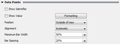 Set the space between the bars of a group in five percent steps from 0% to 50%. This percent value refers to the chart width. For example: 10% bar spacing means 10% of the chart width for all bars, evenly divided between all bars. Only available with bar charts.