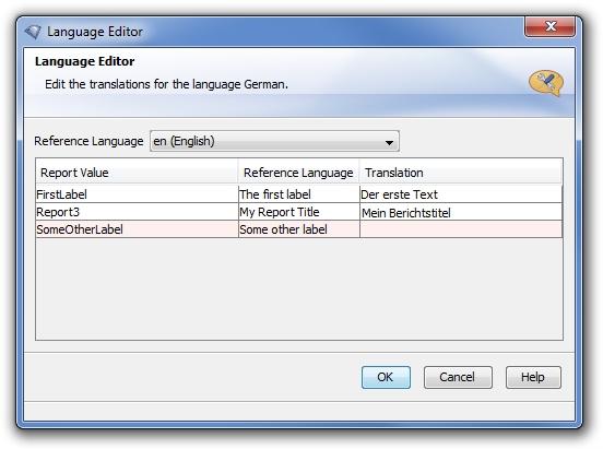 A click on the edit icon will enable you to actually enter the translations themselves for the language you chose in the language editor. The language editor will display all known labels and text content in the report which can be translated.