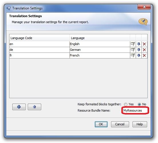 For each report you wish to connect to the resource bundle (which must have been placed in the classpath of the running server or designer), you enter the resource bundle's name in the Translation Settings dialog.
