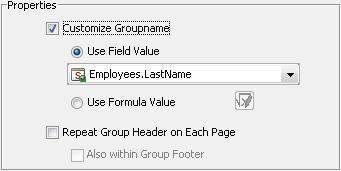 You have many options to improve the appearance of your report. If you want a different label for the group, you can check the "Customize Groupname" option in the "Group Properties" tab and enter the field or the formula in order to provide the group’s label (see following image 4).