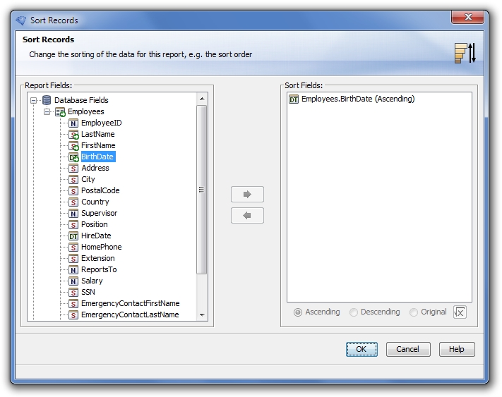 A record sorting allows you to set the order in which the records in your report are displayed. In the following example, you have a table with employee names, and will sort the report’s records by their birth date.